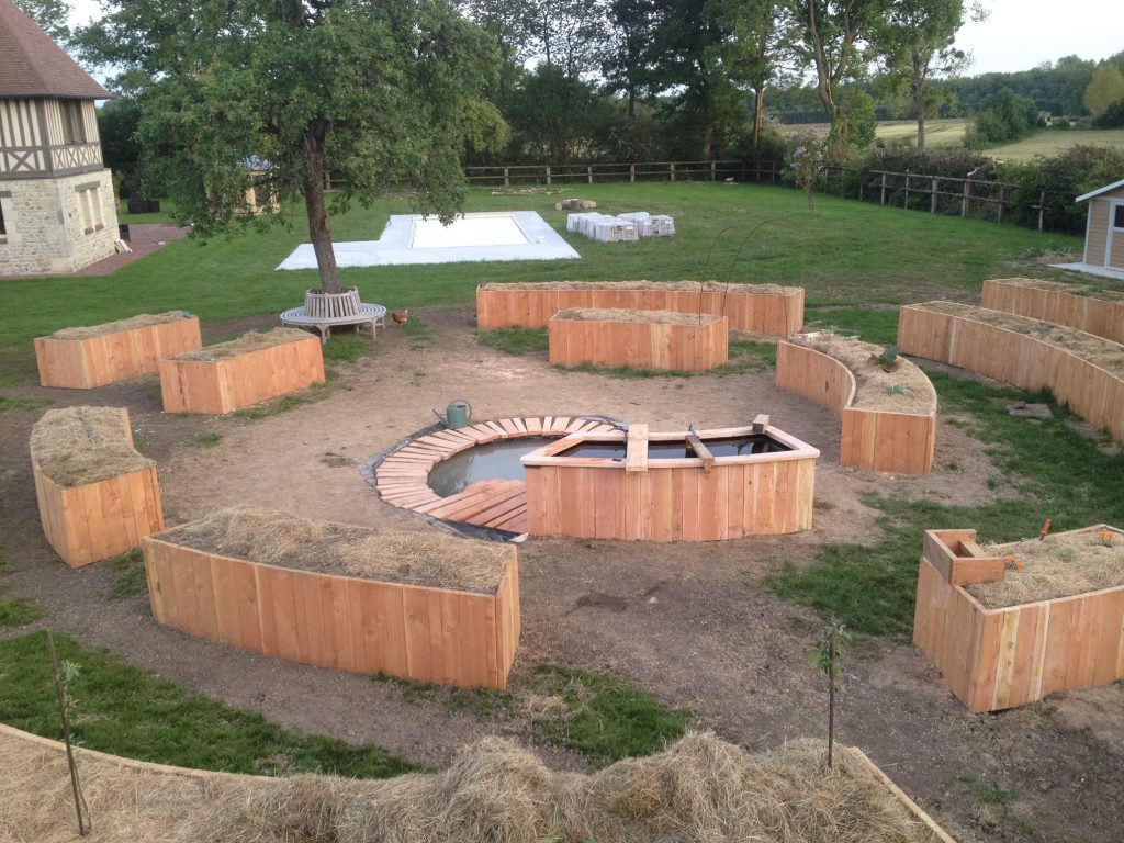 Un potager surélevé en bois, le mandala. Le centre se termine par un bac d'eau et une mare. le potager est paillé pour protéger la terre.