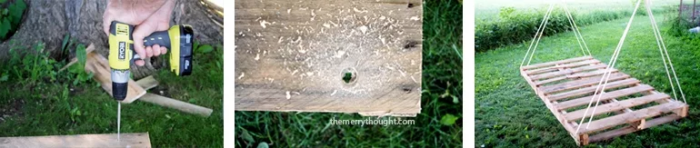 - Percer des trous dans les quatre coins de la palette, à travers les planches supérieure et inférieure. Veiller à ce que le trou soit assez large pour que la corde puisse passer.